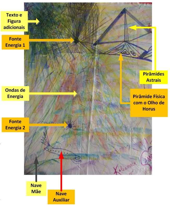 A Mestra Kaliamirra, da Corrente da Avalanche Egípcia, através de um Desenho em uma “Toalha Convencional de Mesa”, como na Fig.1, apresenta uma série de imagens isoladas entre si, aparentemente, porém que no todo remete a uma interferência dos Irmãos Intergalácticos no Processo de Transição Planetária da Terra.