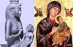 - Nesse aspecto, os Egípcios já estavam familiarizados com a ideia de morte e Reencarnação, logo não acharam estranho Cristo ter ressuscitado. Quanto a Deusa Ísis, essa era considerada como a “Grande Mãe”, e seu culto já havia se espalhado pela Grécia, Roma, Ásia Menor e pela Fenícia. Logo, os Cristãos Egípcios também se valeram dos atributos dessa deusa e a associaram a Virgem Maria, e o filho do casal, o Deus Hórus, foi associado à imagem do Menino Jesus, embora ambos tenham aspectos diferentes: Hórus além de ser o Deus do Céu, e guardião dos faraós, era também o Deus da vingança;