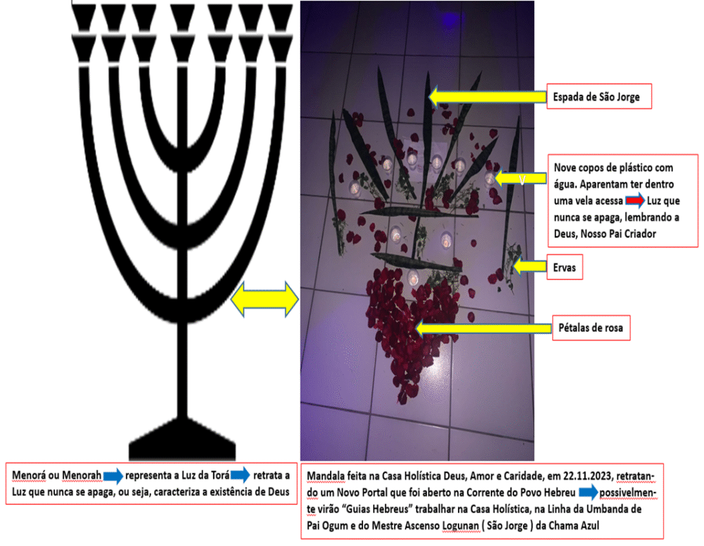 A Mandala feita por ocasião do Assentamento ( Consagração ) na Casa Holística Deus, Amor e Caridade, em 22.11.2023, retrata um Novo Portal que foi aberto na Corrente do Povo Hebreu, caracterizando que possivelmente virão “Guias Hebreus” trabalhar na Casa Holística na Linha da Umbanda de Pai Ogum e do Mestre Ascenso Logunan ( São Jorge ) da Chama Azul.