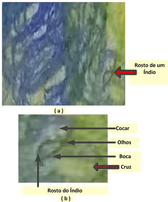 - Rosto de um Índio soprando um fluido amarelo que se transforma em uma cruz (b)