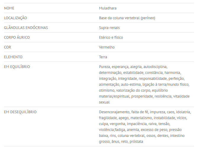Está relacionado com a vontade de sobreviver, a relação com o próprio corpo e com a terra. Rege as pernas, os pés, os ossos e o intestino grosso. As energias ligadas à segurança física, mental e emocional entram por este Chakra.