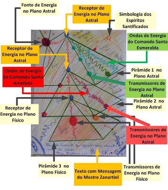 As duas Pirâmides Superiores estão no Plano Astral, vibrando na Quinta Dimensão e serão controladas pelos Comando intergalácticos de Santa Esmeralda e Santa Ametista. No topo de cada uma destas Pirâmides existe um Receptor de Energia, para a captação e transmissão desta Energia aos seus respectivos Transmissores de Energia, os quais por sua vez a retransmitirão ao Receptor da Pirâmide do Plano Físico.