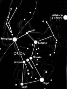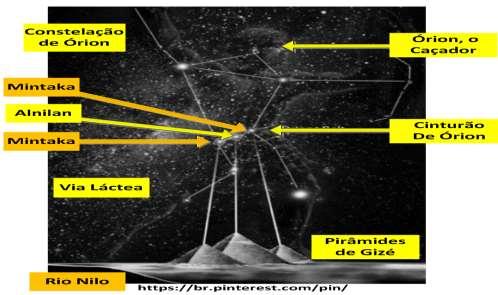 No início de 1990, Bauval e Hangcook perceberam que as Pirâmides de Gizé se alinhavam perfeitamente com três Estrelas da Constelação de Órion (retrata a figura de um caçador), no seu cinturão, conhecida como as Três Marias, como mostradas nas Fig.2c a Fig.2f.