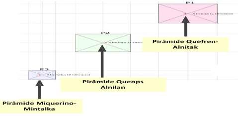 As Fig.2c, Fig.2d e Fig.2e mostram a superposição destas três Pirâmides com as Estrelas da Constelação de Órion, conhecidas como as Três Marias, que são Alnitak, Alnilan e Mintaka, como indicado na Fig.2f.