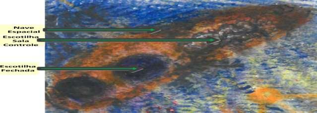 A figura abaixo indica uma Nave Espacial, que quando ampliada, nota-se a presença nítida desta Nave Espacial, com duas escotilhas fechadas e uma espécie de escotilha de controle.