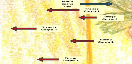 A figura abaixo é relativa a área perto da folha da uva. Com a ampliação desta área, nota-se a presença de duas Entidades, de cor laranja contrastando com o fundo amarelo do desenho, que descem da Nave Espacial.
