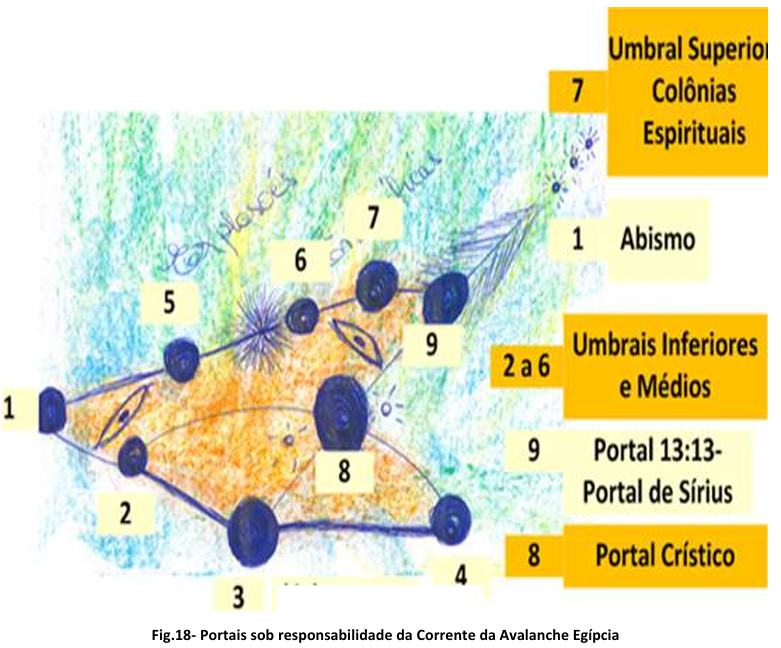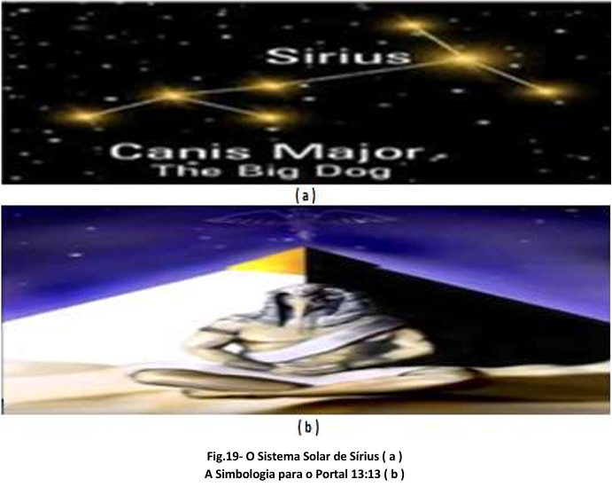 - O Portal 9, sob a responsabilidade da Corrente da Avalanche Egípcia, com controle direto da Guardiã Rasira, continua na prática a ser o Portal 13:13 conectado aos Portais do Sistema Solar de Sírius, conforme ilustra a Fig.18 e a Fig.19a, na qual o Portal 9 na Fig.18 aponta para três Estrelas ( cada Estrela é um “Sol” ).